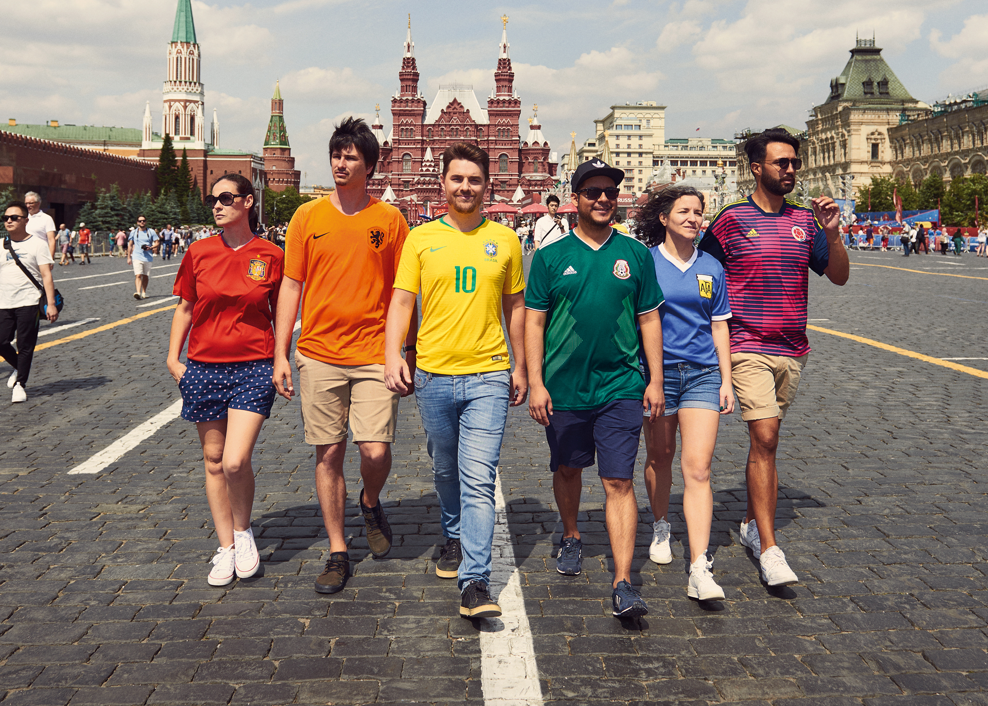 Six activists from six countries wore uniforms from their countries’ football teams in all six colors of the LGBTQ Pride flag and walked around Moscow.