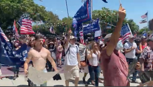 Despite the fact that they were gathered close together and cheering loudly and shouting, relatively few of those at the rally wore face coverings, which are required by law to reduce the transmission of the COVID-19 virus, reports WEHOville.